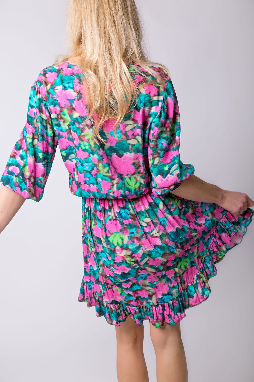 Viki to krótka, kolorowa sukienka uszyta z trójwymiarowej, wysokogatunkowej wiskozy, z dekoltem w kształcie litery V, bufiastymi rękawami zakończonymi gumką, która pozwala na dopasowanie długości rękawa. Sukienka jest marszczona w pasie, tył jest lekko wydłużony, a spód wieńczy delikatna falbana, która nadaje zwiewności. Sukienka doskonale będzie się prezentować w letniej oprawie. Świetna propozycja na plaże, i na co dzień do sportowych butów.